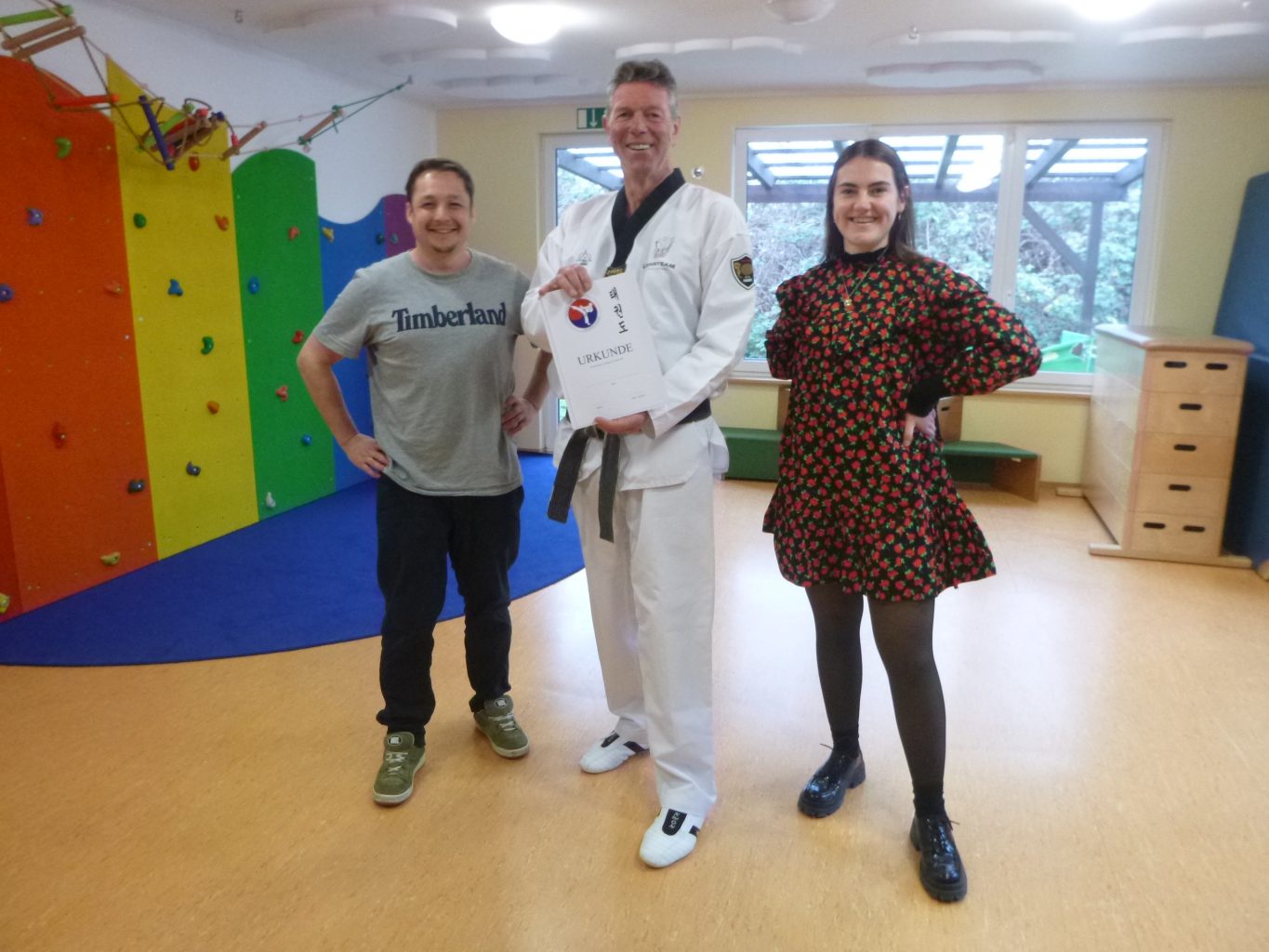 “ Mir geht keiner an die Wäsche “ So heisst seit vielen Jahren ein Selbstbehauptungkurs im Kindergarten Paulus. Kinder im Vorschulalter lernen dabei eine räumliche Distanz zu einer anderen ihnen vielleicht unbekannten oder bekannten Person zu wahren. Sie strecken einen Arm nach vorne, gehen dabei vor oder zurück und zeigen damit ihrem Gegenüber, hier geht es nicht weiter. Unterstützt wird diese Geste durch das laute ausrufen von, „Stopp“, „Halt“, „ich will das nicht“ oder „lass das“. Oft dienen gerade diese Wörter, laut ausgesprochen, um den Anderen der gerade „dummes“ vorhat abzuhalten oder in ein Gespräch zu verwickeln. Sollte das nicht so sein lernen die Kinder mit den Händen mögliche Griffe oder ähnliches Vorgehen abzuwehren und den „Bösen“ wegzuschupsen. Die Kinder nehmen diese vielen verschiedenen Techniken der leichten Selbstverteidigung schnell auf und setzen diese in die Tat um. Der Einsatz der Fäuste oder Schläge werden nicht beigebracht. Um die Vorschulkinder in ihrer Achtsamkeit zu fördern werden verschiedene Spiele oder Aktionen unternommen. Auch das Fallen, die Vorwärtsrolle, die Rückwärtsrolle und das Springen aus einer großen Höhe wird geübt. Als Belohnung für die gute Leistung und Mitarbeit bekam jedes Kind eine Urkunde für besondere Leistungen im Taekwondo. Ein großes Lob an die mitwirkenden Betreuer des Kindergarten Paulus für ihre Unterstützung und ihren Mut.